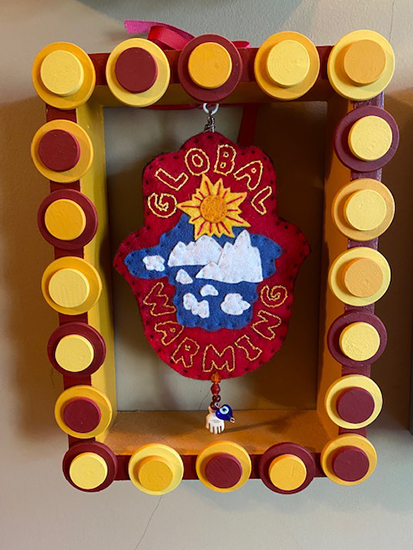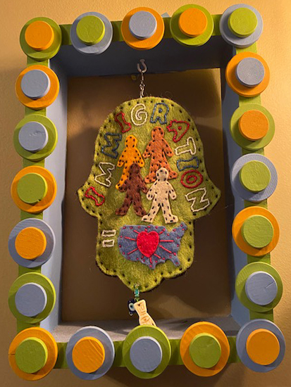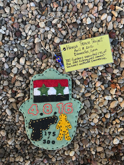 My social justice creativity began with making felt protest banners for marches. The two shown in this gallery were carried in many marches. In 2016 I began the Hamsa Peace Project. Knowing the atrocities we heard about on the news were the tip of the ice burg, I began an investigation into terrorist acts across the world that would occupy me for a year. The resulting artwork encompassed acts of terrorism over 1 year, in 32 countries. Arranged by month, each felt hamsa is embroidered with an interpretation of an event and the reverse side is embroidered with a countering positive message. Other smaller artworks have addressed immigration, global warming, and endangered species.
