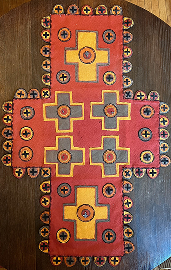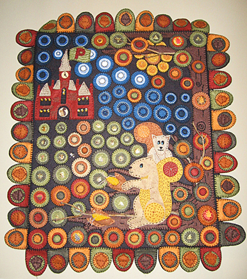 My hands have held needle and thread since I was about 7 years old. Since that time, I've used variations on those materials to create many different things. I've knit, crocheted, beaded, sewn, quilted, embroidered…about 10 years ago I became fascinated with the 18th/19th C. art of the simple penny rug. Made of cast-off pieces of cloth and sewn with circle upon circle, their charm laid in their combinations of colors and materials, with simple stitching. I love looking for new ways to interpret materials, colors, and subject matter in my interpretive pennyrugs.