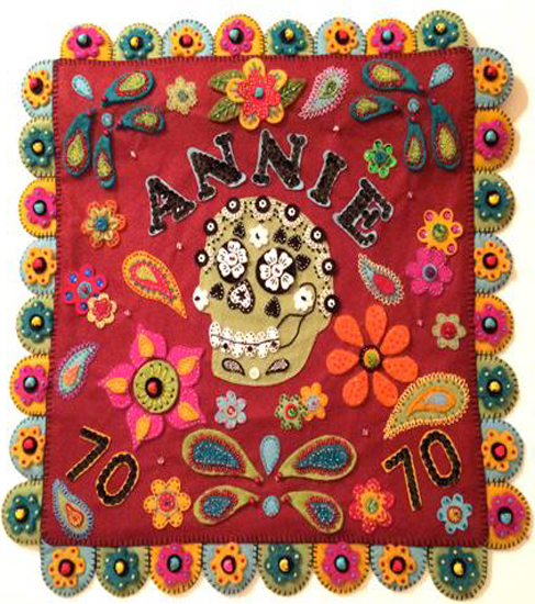 I LUV SKULLSI do! One of several felt skull themed penny rugs created over the years. -