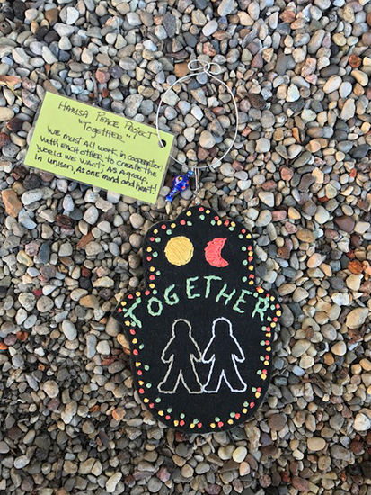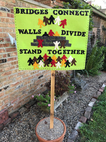 BRIDGES CONNECT, WALLS DIVIDE, STAND TOGETHER -- FRONTFelted banner in protest of President Trump's project to build more walls between us and Mexico; reverse shows people of all colors standing together to RESIST HATE! -