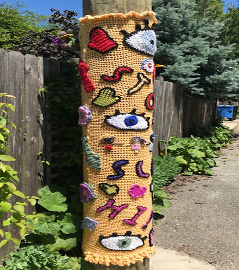 CAUTION AHEAD A crocheted telephone pole wrap to warn large vehicles to slow down as they pass…in a friendly way! -