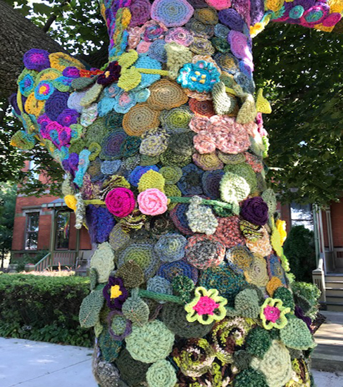 Several years ago I decided to pick up my knitting needles again after 30 years. After a few small projects to remember how to knit and purl, I embarked on my first public art project, my Winter Tree. Since winter is a very depressing time for me I decided I would decorate the tree in front of my house in beautiful colors to look at all winter. I started with circles of browns and growing up through greens, then multiple colors to finally end in a rainbow of colors at the top,I covered the tree as high as I could reach with a ladder. I enjoy seeing it every day and it seems to be enjoyed by passersby as well. I added a rope of different flowers and some extra leaves towards the top for those dull winter days when my tree has lost its real leaves.