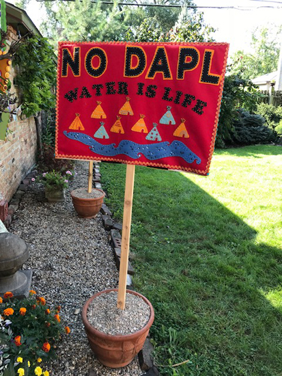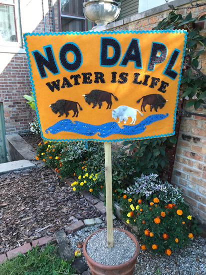 NO DAPL -- BACKWater is Life – a felted banner used in numerous protests over many years -one-side showing buffalo with a sacred white buffalo along a river; the reverse shows an encampment alongside the river. -