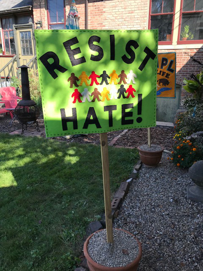 BRIDGES CONNECT, WALLS DIVIDE, STAND TOGETHER -- BACKFelted banner in protest of President Trump's project to build more walls between us and Mexico; reverse shows people of all colors standing together to RESIST HATE! -