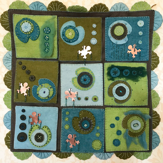 THE JOURNEYFelted penny rug showing the journey of adult and baby turtles through their lily pond; features hand-sawn copper turtles, roving, beads, natural stones, embroidery. -