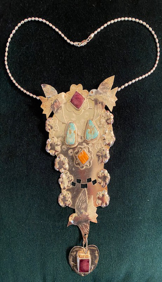 SILVER JEWELRYThis piece is a large silver pendant with numerous cabochon stones, peace doves and flower rosettes, in the shape of a skull. -