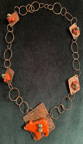 COPPER BEAR JEWELRYMy favorite copper piece as it has numerous bear fetishes with turquoise on stamped copper, linked by hand-made copper rings. -