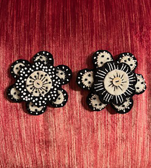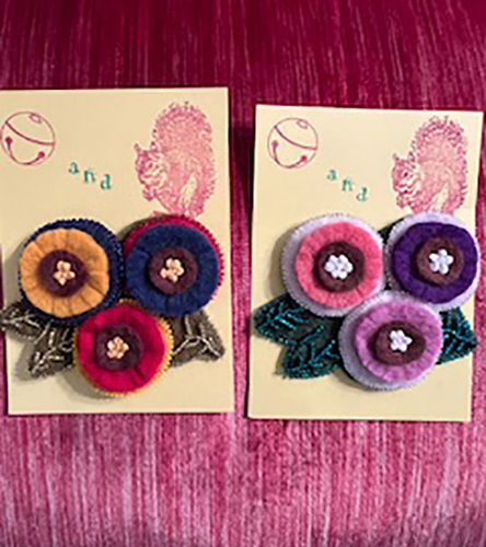 I’ve experimented with a number of shapes of felt flower pins, both single and multiple flower heads. Beading and embroidery brings them to life and this year have added seasonal colors and formats, such as Halloween and many holiday themed pins.