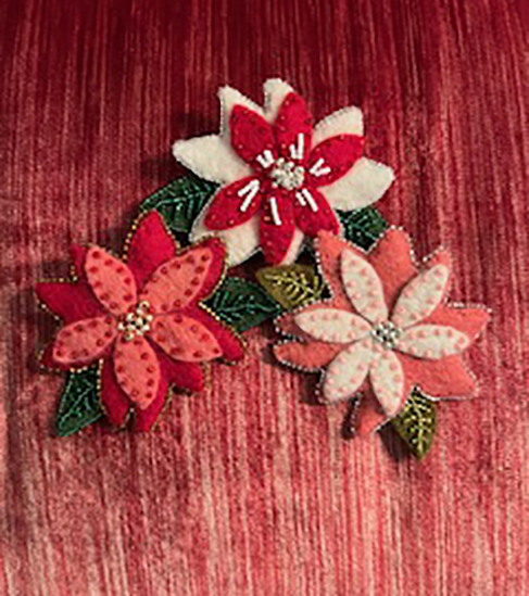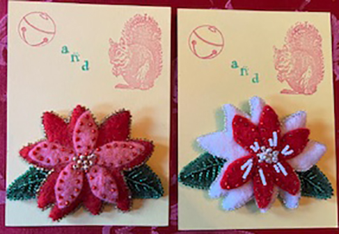 HOLIDAY PINS I’ve experimented with a number of shapes of felt flower pins, both single and multiple flower heads. These were made for the midwinter holidays. -