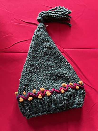 As a quick project, I enjoy making hats of various style and then embellishing them with knit or felt flowers, beads or embroidery. Using both acrylic and wool yarns, the hat shapes inform me as to what decorative elements to add.