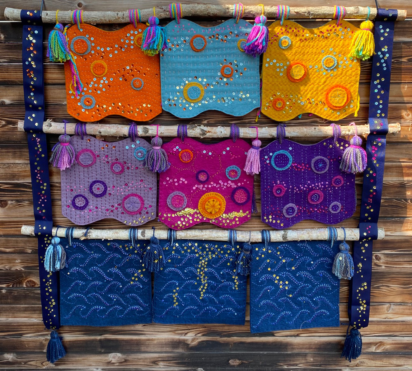 In 2025, I began to investigate Runes and Sigils and created a series of small Intention pins around the themes of 9 ancient Bind Runes (Viking and/or Germanic). These small pins are embroidered with a specific rune/intention such as Good Luck, Health, Love, Strength with a small pocket into which a stone representing that intention is placed.